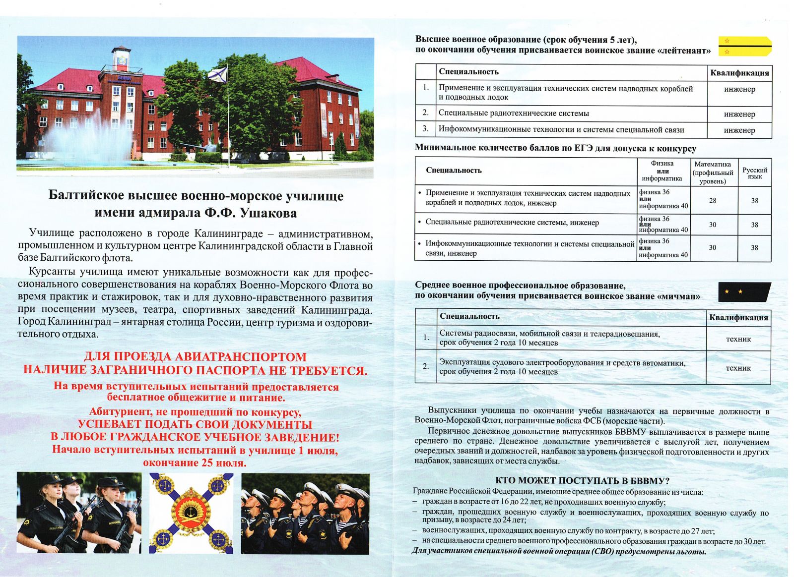 Балтийское высшее военно - морское училище им. адмирала Ф. Ф. Ушакова в г. Калининграде: https://kaliningrad.ucheba.ru/uz/103452 (Ссылка на буклет)