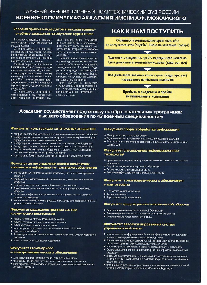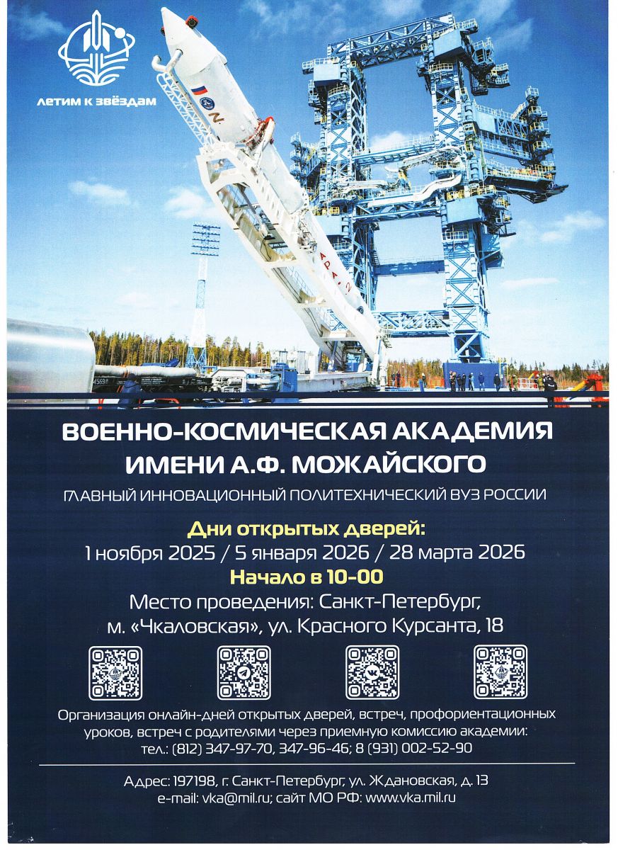 Главный инновационный политехнический ВУЗ России Военно- космическая академия им. А Ф. Можайского. Дни открытых дверей: 1 ноября 2025, 5 января 2026, 28 марта 2026 в 10.00 по адресу: Санкт - Петербург, м."Чкаловская", ул. Красного Курсанта, 18 (Ссылка на буклет стр. 1, стр 2)