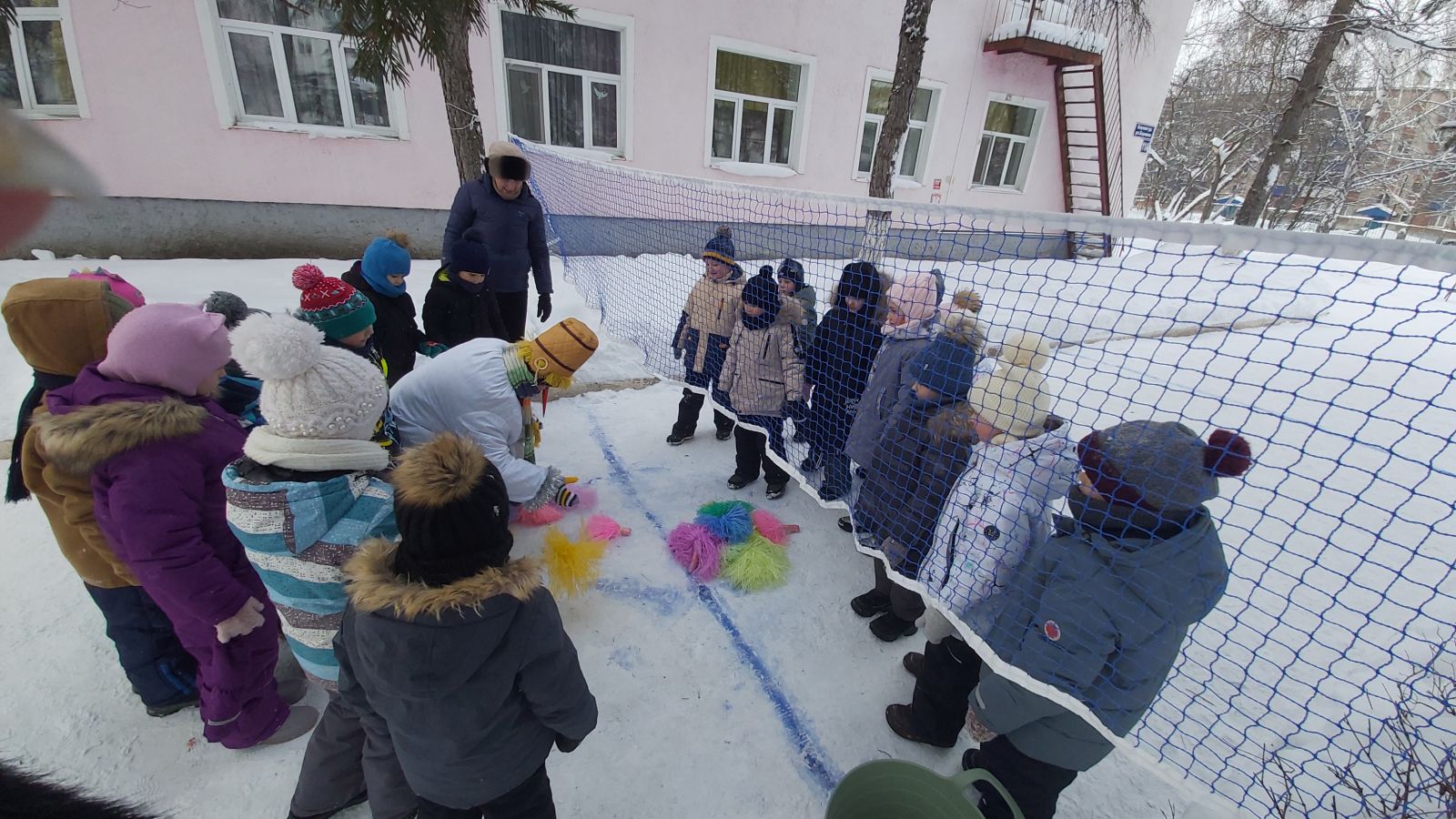 «Снежный баскетбол». А здесь вместо мячей летали… цветные махрушки! Море веселья детям было гарантировано! А счёт вёл самый честный судья — добрый Снеговик!