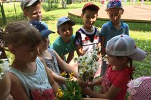 Малыши пришли в гости старшим товарищам, пришли с цветами поучиться венки плести, а те их в игру позвали - игру хороводную, «Венок» называется.