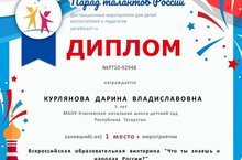 Курлянова Дарина, воспитанница нашей школы-детского сада участвовала во Всероссийской образовательной викторине "Что ты знаешь о народах России?" и стала победителем (1 место). Также поздравляем воспитателя Курлянову Юлию Александровну, подготовившую победителя. Молодцы, поздравляем!!!