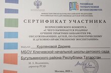 Воспитанница нашей школы-детского сада Курлянова Дарина участвовала во Всероссийском конкурсе "С чего начинается Родина? Лучшие практики библиотек РФ, обслуживающих детей, по патриотическому и духовно-нравственному воспитанию" и получила сертификат участника. Молодец, поздравляем!