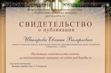 Настоящее свидетельство выдано учителю начальных классов Шакировой Евгении Валерьевне за опубликованный материал на сайте ped-kopilka.ru. Название публикации: Зимние стихи для 1 - 2 классов.