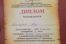 Воспитанник Ключевской НШ-ДС Асылгареев Аяз участвовал в муниципальном конкурсе чтецов "Любимые произведения А.С.Пушкина", посвященному 225-летию со дня рождения поэта, в номинации "Лучший исполнитель" и занял 2-е место, награжден дипломом. Поздравляем Аяза и желаем дальнейших творческих успехов!