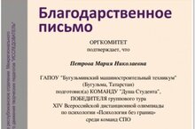 под руководством педагога-психолога Петровой М.Н заняла 1 почетное место, среди команд среднего профессионального образования!!!В индивидуальном туре приняли участие 17 студентов первого, второго и четвертого курсов. Все участники получили дипломы лауреатов, призеров и победителей!!!!