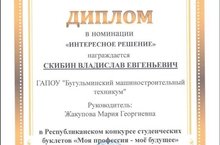 Студенты группы 126И Скибин Владислав и Галимова Амалия (руководитель Жакупова М.Г.) приняли участие в Республиканском конкурсе студенческих буклетов "Моя профессия - мое будущее" и стали победителями в номинациях "Оригинальность подхода" и "Интересное решение"