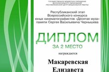 Елизавета Макаревская заняла второе место на республиканском конкурсе юных кинематографистов «Десятая муза» памяти Сергея Васильевича Чернышёва в номинации «Анимационное искусство».