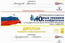 Короновирусная инфекция, еще недавно бушевавшая по всей планете, вносила свои корректировки в планы большинства мероприятий и событий. Так и Всероссийская конференция "Юные техники и изобретатели" в поддержку новых санитарных норм изменила свой формат, и в 2021 году проходила в форме дистанционной встречи. Тем не менее, опыт получился достаточно успешный, и для воспитанников Центра детского технического творчества Захарова Артема и Серебрякова Романа прошлая конференция ознаменовалась победами на региональном этапе. Наши юные изобретатели успешно выступили со своими проектами, чем заслужили высокие оценки со стороны уважаемого жюри. Хочется пожелать ребятам дальнейших успехов и развития в своей творческой деятельности.