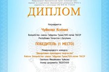 Работа, посвященная 100-летию ТАССР, отмечена Дипломом за I место в Международном конкурсе «Солнечный свет» (Международное сетевое издание «Солнечный свет»).