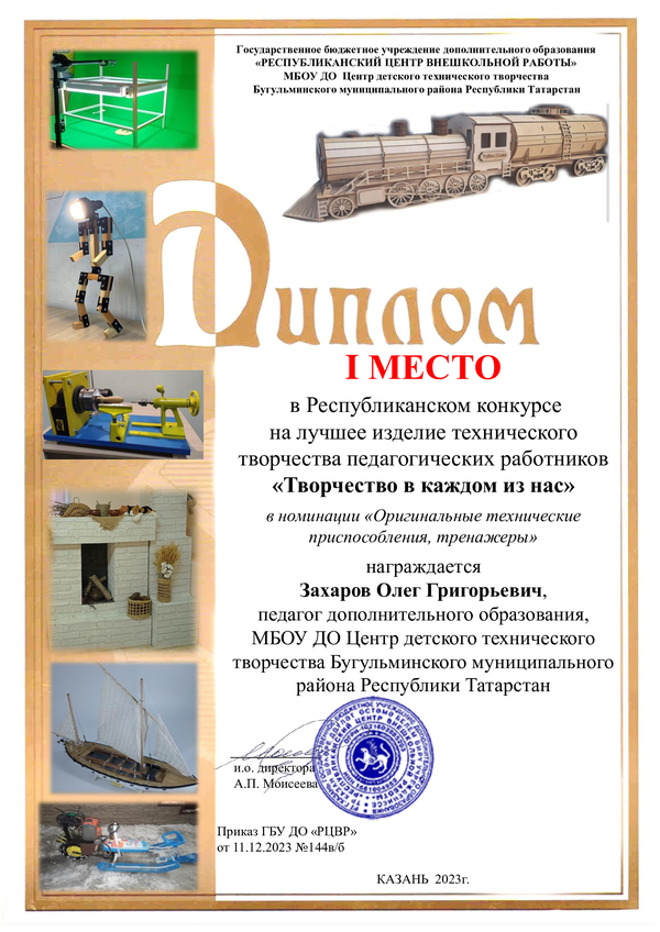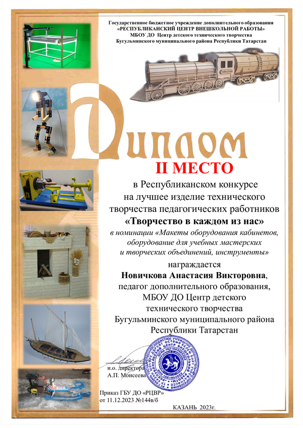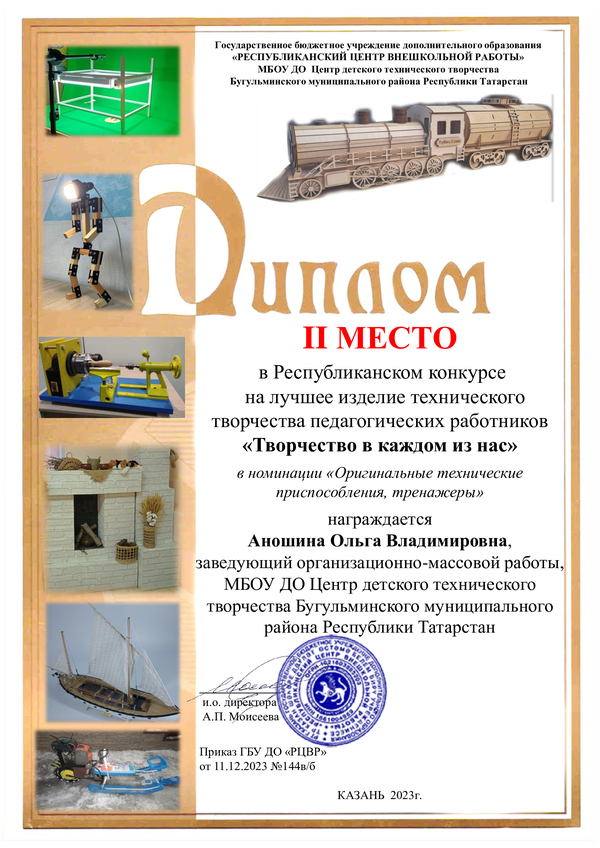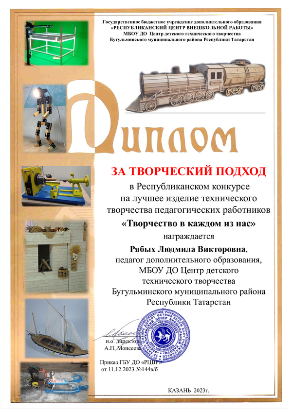 23. Республиканский конкурс на лучшее изделие технического творчества педагогических работников "Творчество в каждом из нас" Диплом 1 место Диплом 2 место Диплом 2 место Диплом 3 место Диплом за творческий подход Диплом за творческий подход Диплом за творческий подход Сертификат