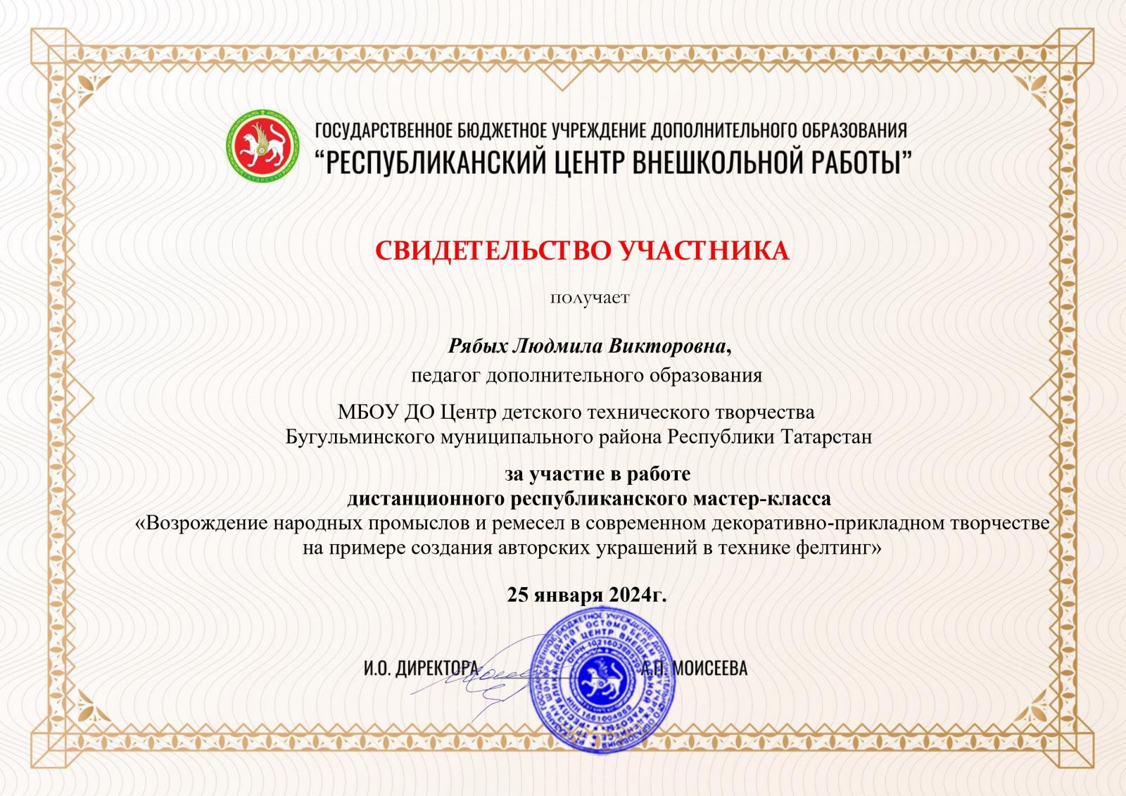 13. Республиканский мастер-класс "Возрождение народных промыслов и ремесел в современном декоративно-прикладном творчестве на примере создания авторских украшений в технике фелтинг" Свидетельство