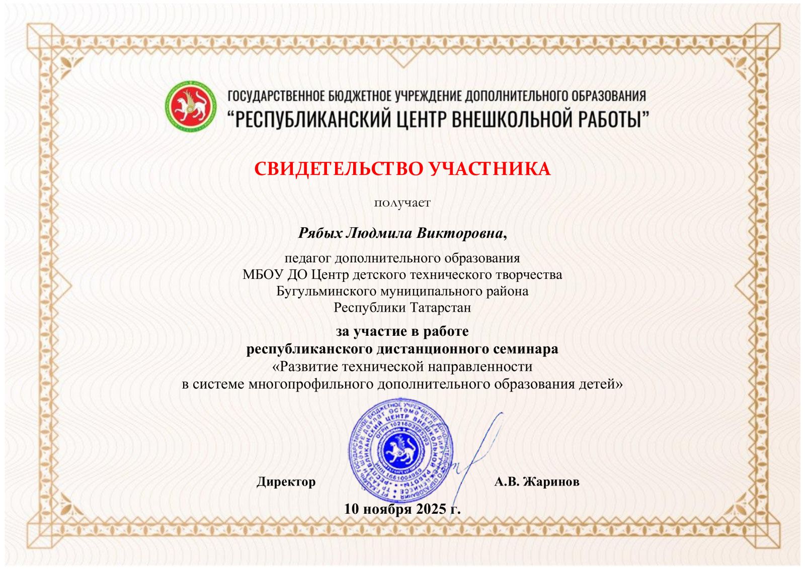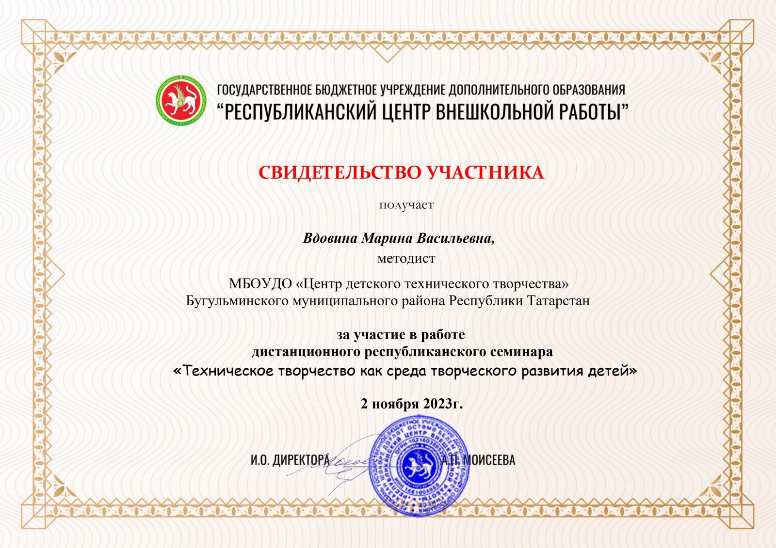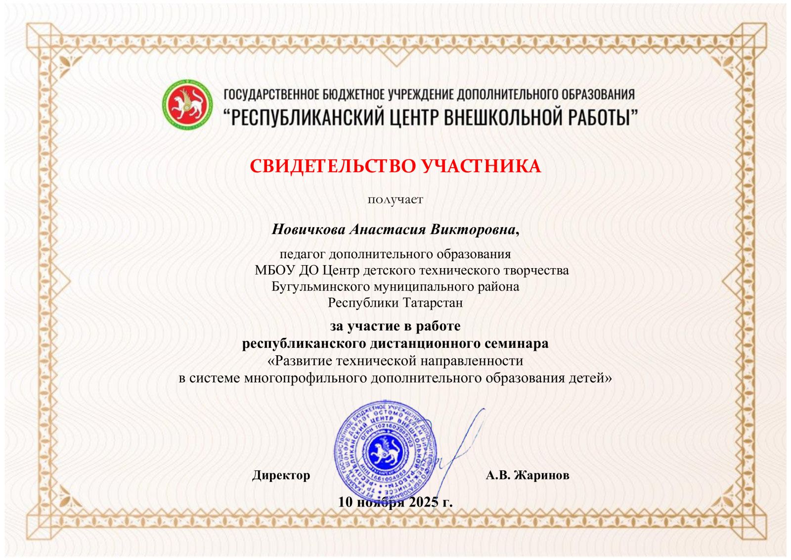 6. Республиканский дистанционный семинар «Развитие технической направленности в системе многопрофильного дополнительного образования детей» Свидетельство Свидетельство
