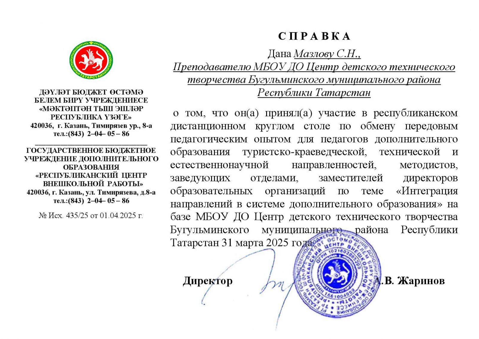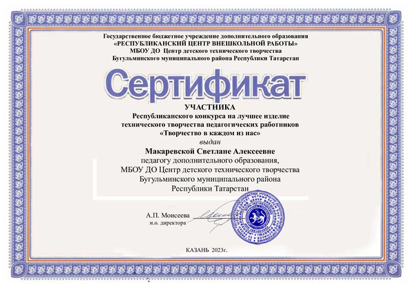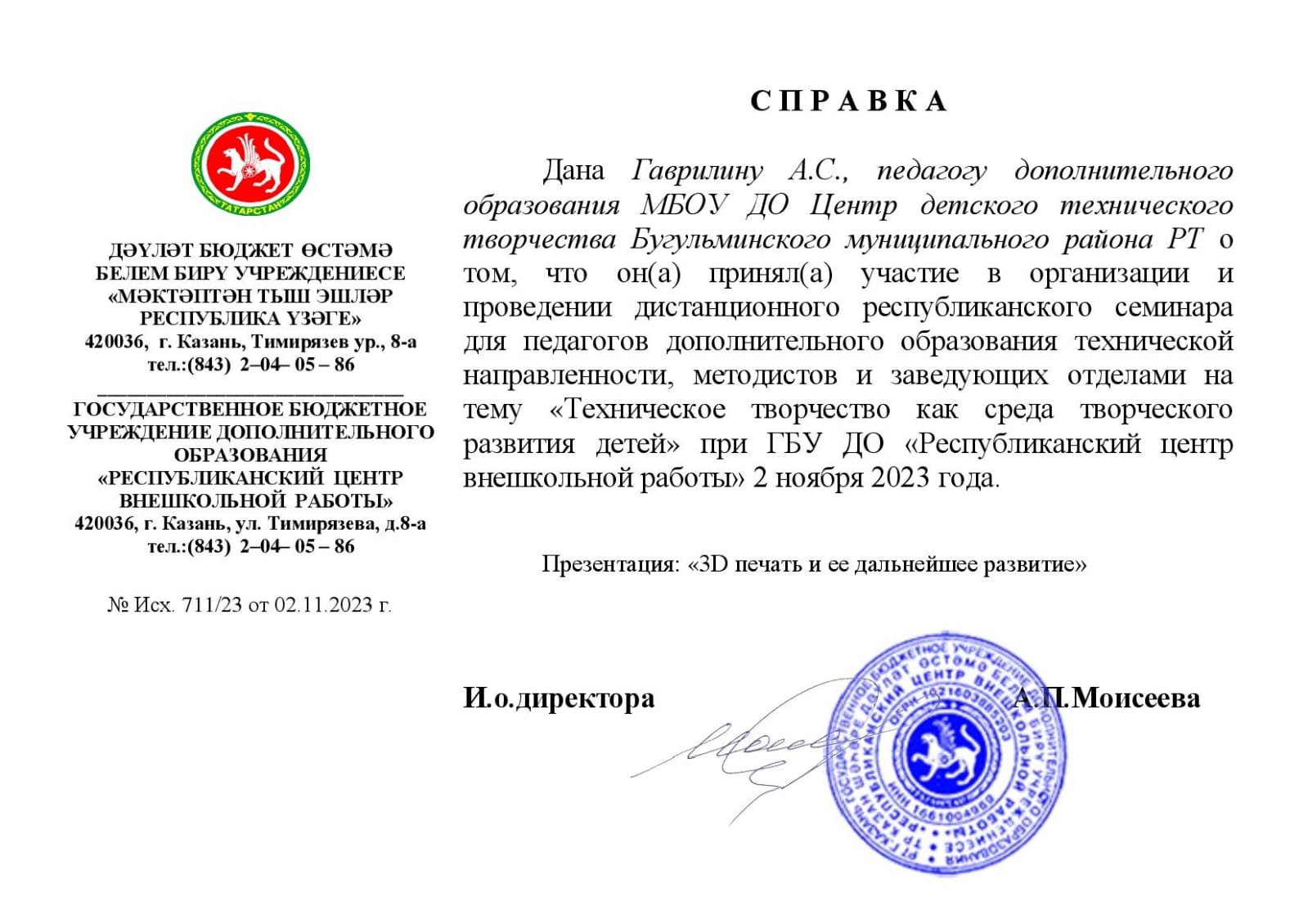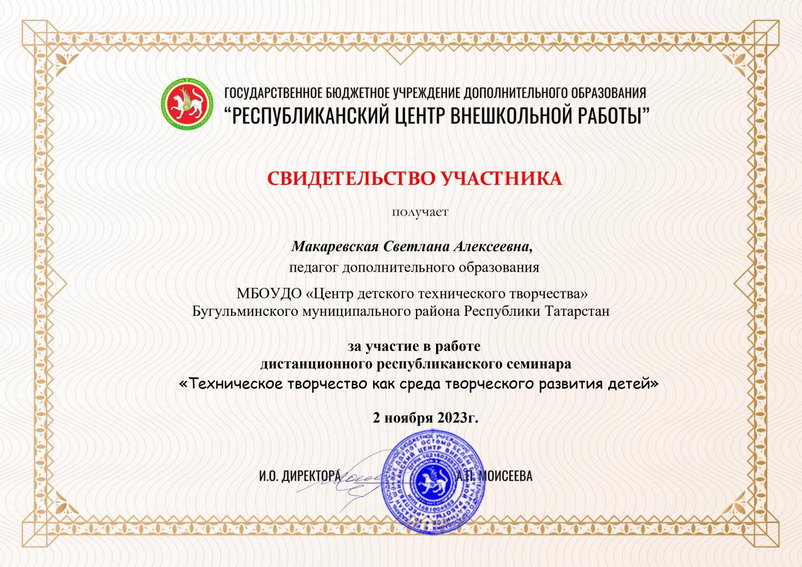6. Республиканский дистанционный семинар «Развитие технической направленности в системе многопрофильного дополнительного образования детей» Свидетельство Свидетельство