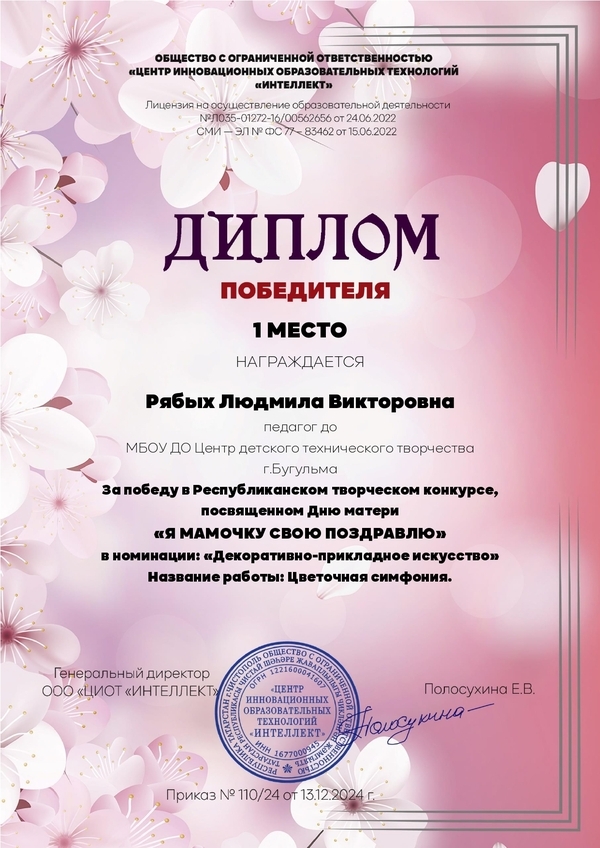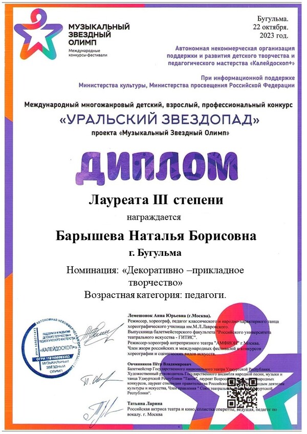21. Международный многожанровый детский, взрослый профессиональный конкурс "Уральский звездопад", номинация "декоративно-прикладное творчество" Диплом лауреата III степени