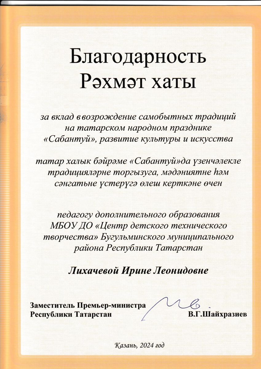 5. Республиканский конкурс по изготовлению изделий народных художественных промыслов в рамках проведения татарского народного праздника «Сабантуй» Благодарность