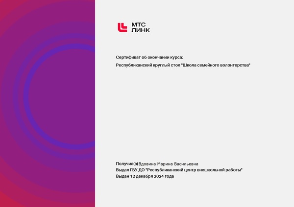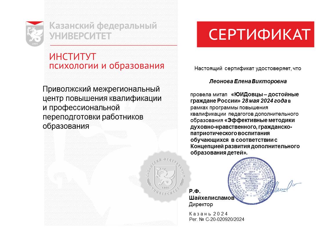 18. Республиканские курсы повышения квалификации педагогов дополнительного образования "Эффективные методики духовно-нравственного, гражданско-патриотического воспитания обучающихся в соответствии с Концепцией развития дополнительного образования детей", митап "ЮИДовцы - достойные граждане России" Сертификат