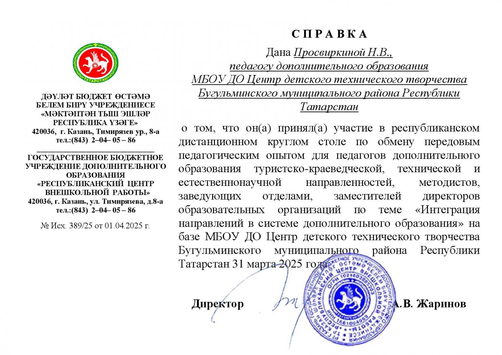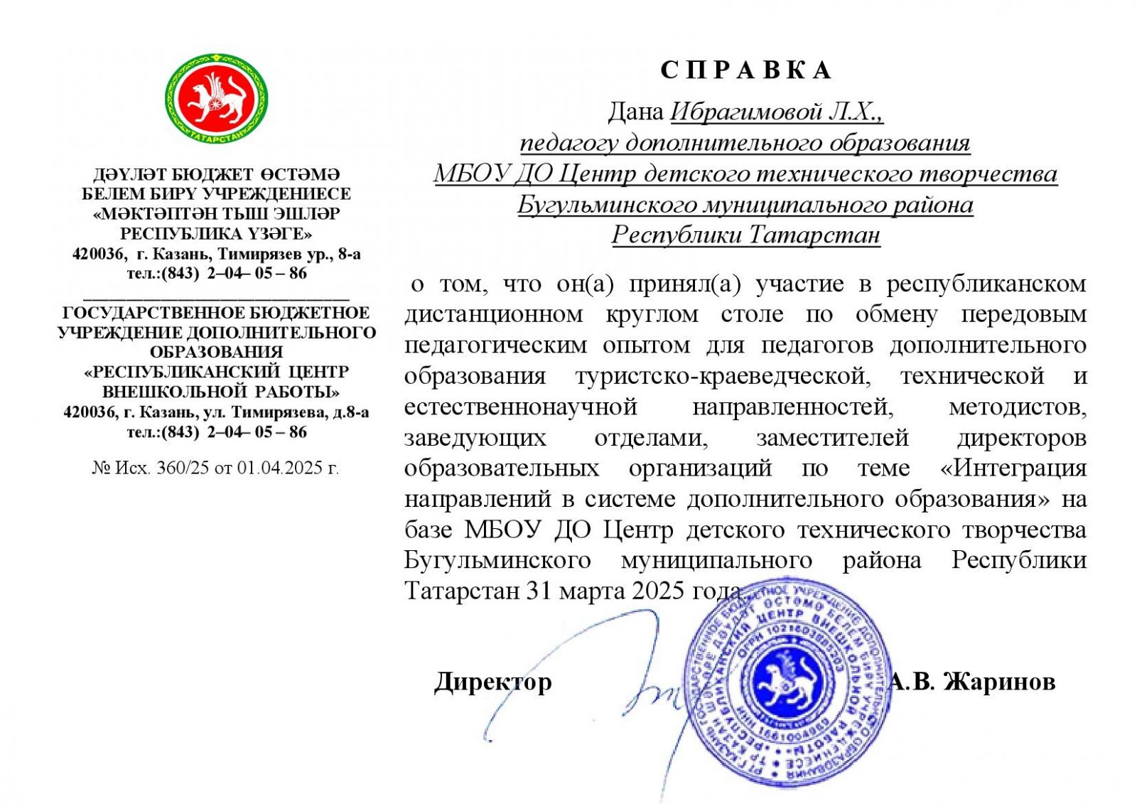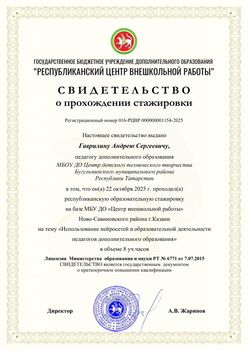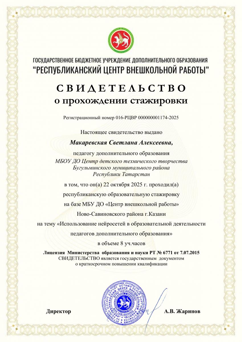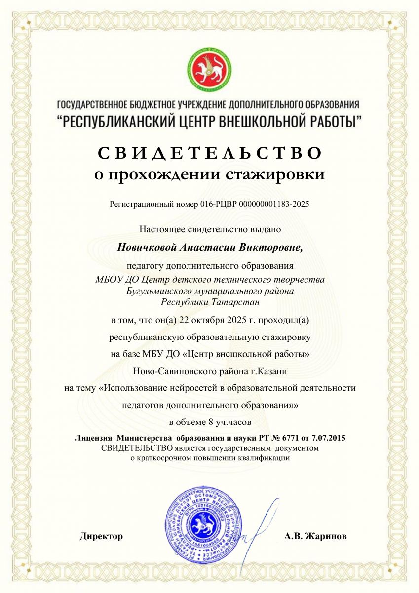 2. Республиканская образовательная стажировка по теме "Информационные технологии. Применение ИИ чатов в образовательном процессе. Разработка веб-приложений. Технология виртуальной реальности" на базе МБОУ ДО "Детский технопарк "Кванториум" - Дом пионеров" г.Альметьевск Свидетельство Свидетельство Свидетельство Свидетельство