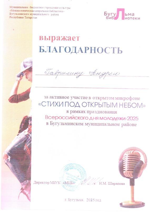 4. Открытый микрофон «Стихи под открытым небом», в рамках празднования Всероссийского дня молодежи-2025 Благодарность