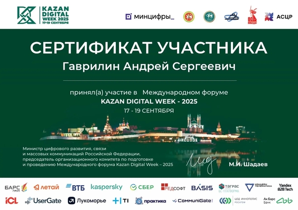 8. Международный форум "KAZAN DIGITAL WEEK-2025" Сертификат