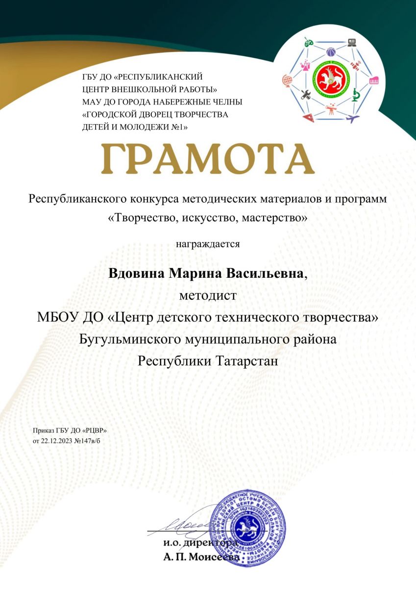 10. Республиканский конкурс методических материалов и программ "Творчество, искусство, мастерство" Грамота Грамота