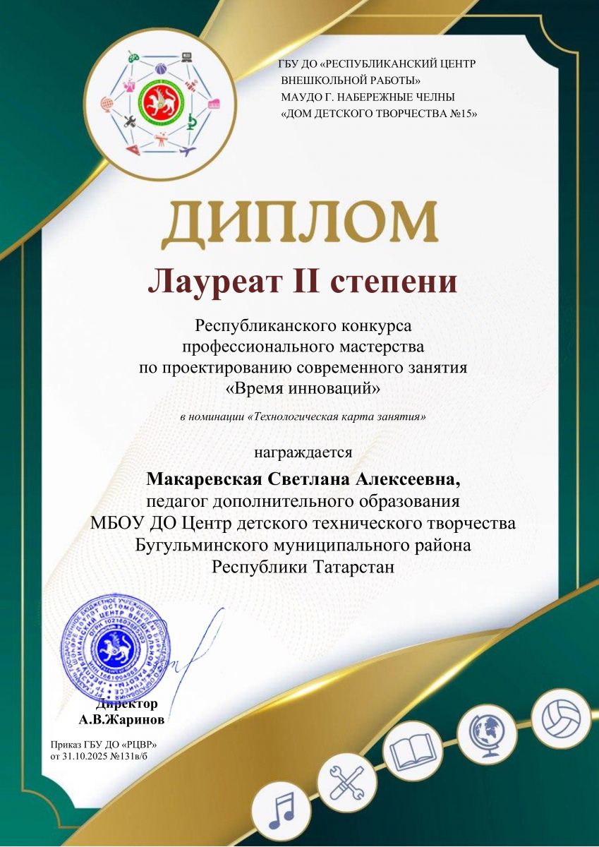 3. Республиканский конкурс профессионального мастерства по проектированию современного занятия "Время инноваций", номинация "Технологическая карта занятия" Диплом Лауреата II степени