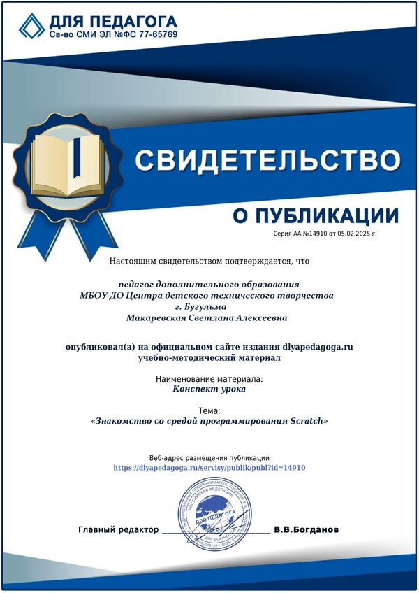 12. Свидетельство о публикации учебно-методического материала. "Знакомство со средой программирования Scratch" Свидетельство о публикации