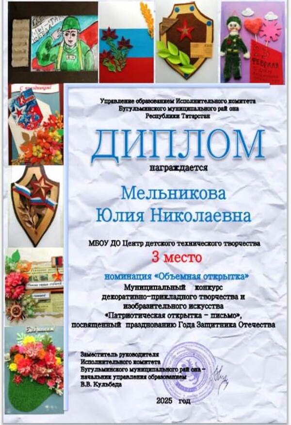 11. Муниципальный конкурс декоративно-прикладного творчества и изобразительного искусства "Патриотическая открытка-письмо",посвященный празднованию Года Защитника Отечества Диплом 3 место