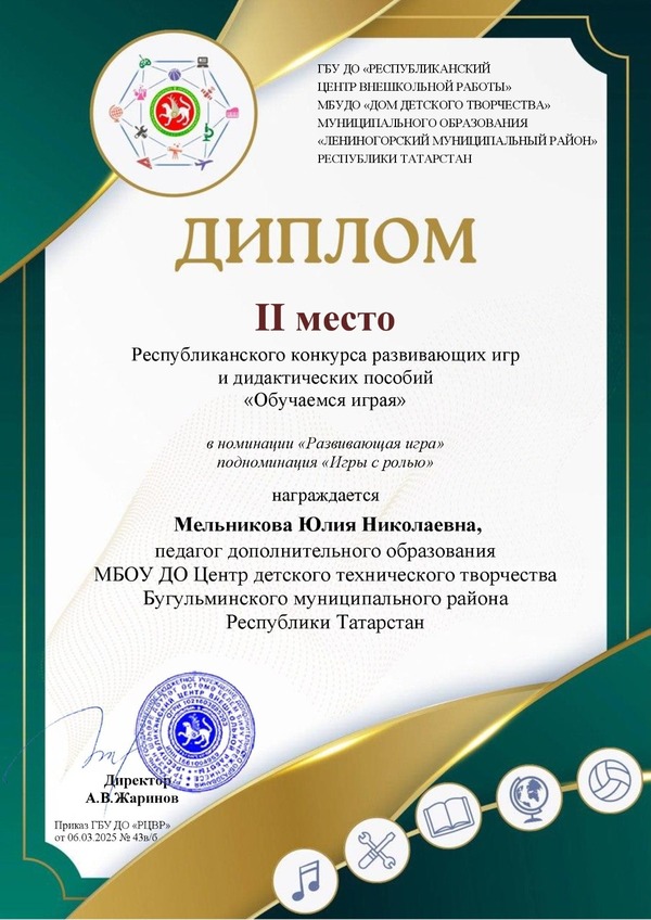 13. Республиканский конкурс развивающих игр и дидактических пособий «Обучаемся, играя», номинация «Дидактическая игра», подноминация «Настольно-печатные игры» Диплом 2 место, номинация «Развивающая игра», подноминация «Игры с ролью» Диплом 2 место