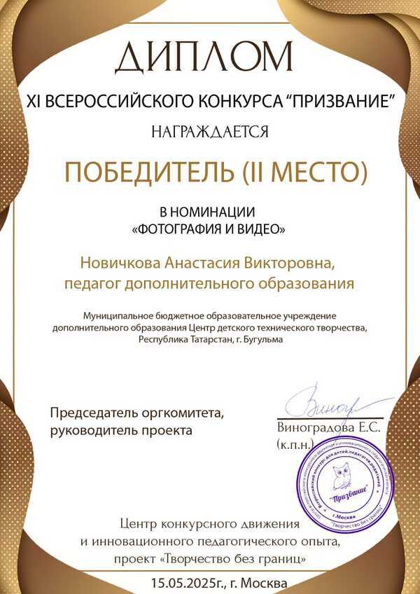 18. XI Всероссийский конкурс «Призвание», номинация «Фотография и видео» Диплом Победителя 2 место