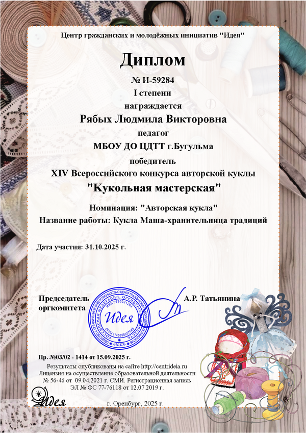5. XIV Всероссийский конкурс авторской куклы «Кукольная мастерская» Диплом 1 место