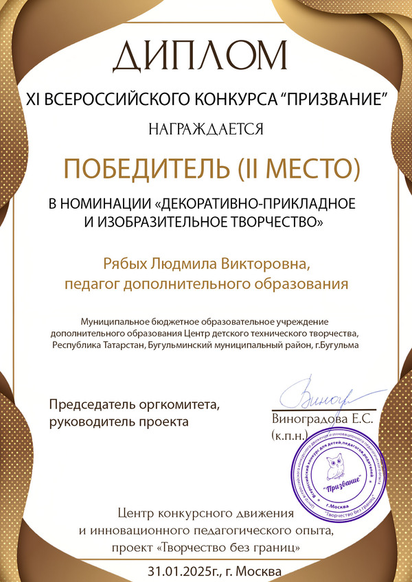 8. XI Всероссийский конкурс "Призвание", номинация "Декоративно-прикладное и изобразительное творчество" Диплом Победителя