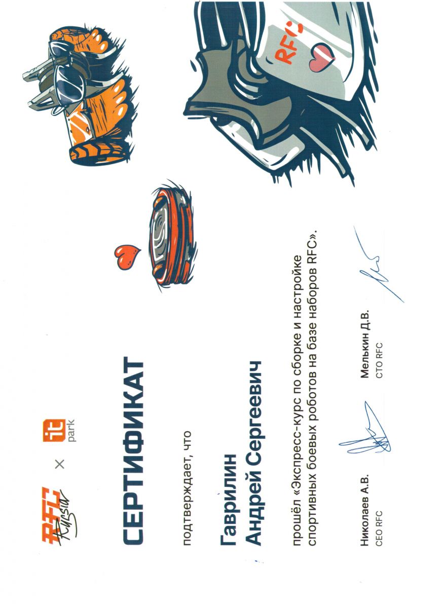 1. "Экспресс-курс по сборке и настройке спортивных боевых роботов на базе наборов RFC"Сертификат