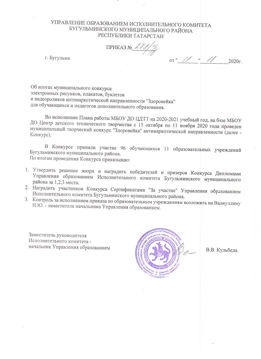 Опубликовано: 12.11.2020Подведены итоги муниципального конкурса антинаркотической направленности "Здоровейка", организаторами которого стали Управление образованием Исполнительного комитета Бугульминского муниципального района и МБОУ ДО Центр детского технического творчества. Дипломы победителей и сертификаты участников направлены по электронной почте заявителям на участие. Приказ об итогах: /upload/storage/org649/files/Приказ 001.jpg /upload/storage/org649/files/приложение 001.jpg