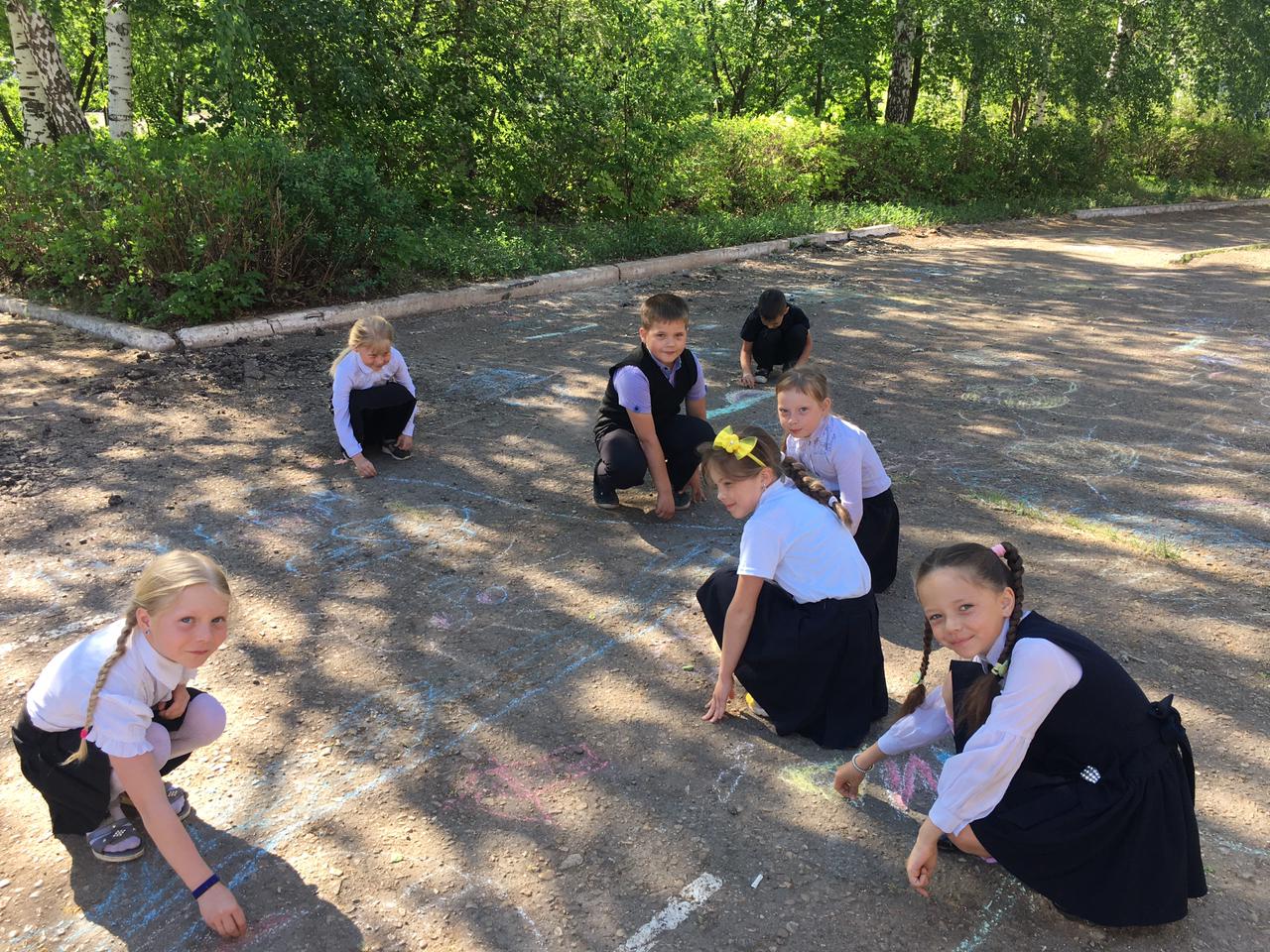 Ученики 5 класса исполнили песню "Солнечный круг", а первоклассники рисовали цветными мелками рисунки на асфальте "Мы за мир!"