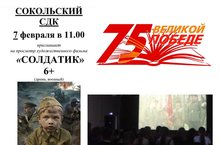 7 февраля учащиеся начальной школы выезжали в Сокольский ДК на просмотро фильма «Солдатик ». После просмотра фильма состоялась беседа о фильме . Участники кинолектория обсудили какие события отражены в фильме, какими средствами киноискусства актёры раскрывают образы главных героев, как музыка передаёт и эмоционально усиливает отдельные эпизоды фильма.
