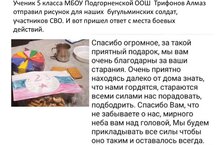 Ученик 5 класса Подгорненской школы Трифонов Алмаз отправил рисунок для наших бугульминских солдат,участников СВО. И вот пришел ответ.