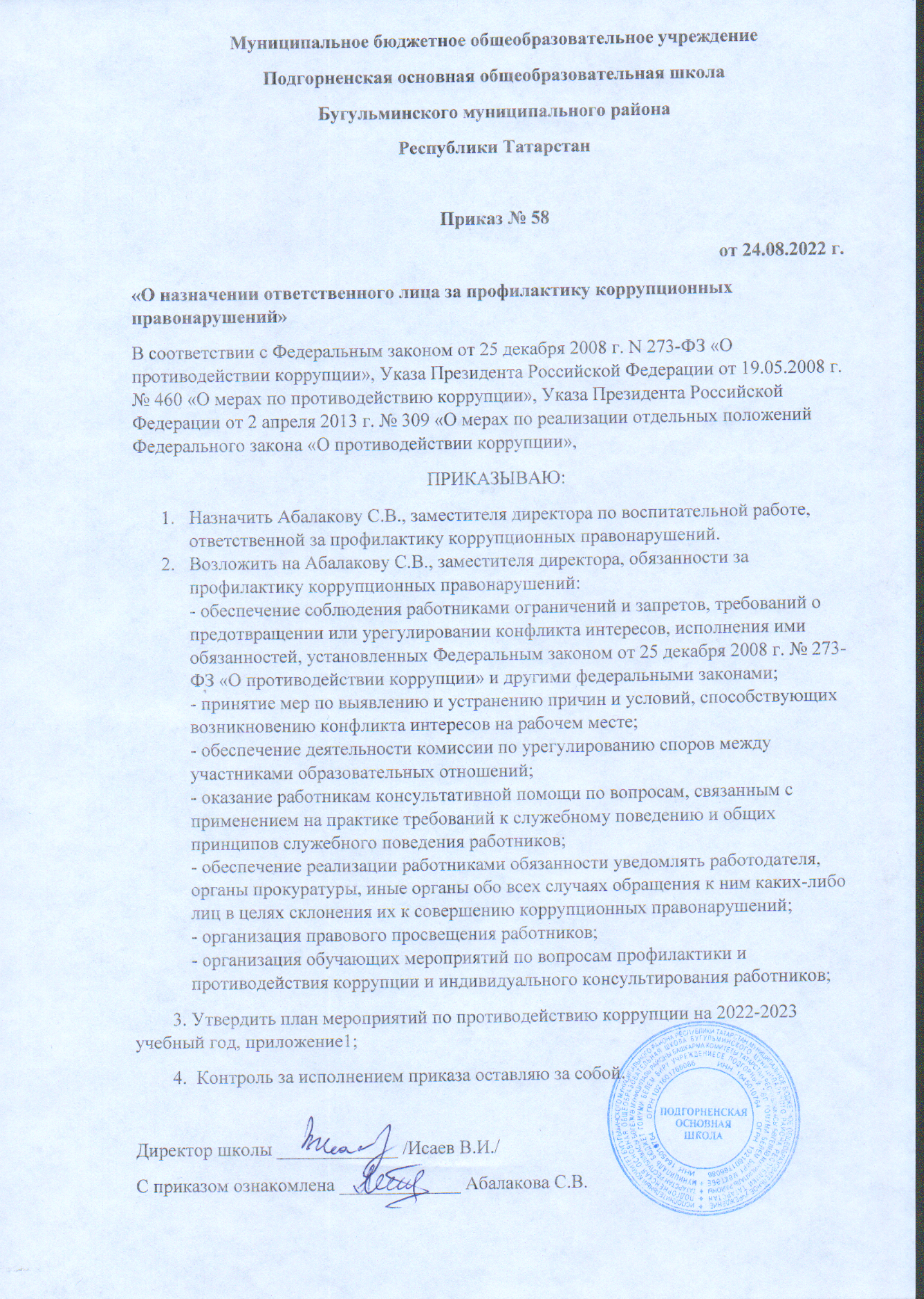 Приказ о назначении ответственного лица за профилактику коррупционных правонарушений