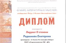 Ученица 1 класса Родионова Екатерина приняла участие в республиканском конкурсе художественного чтения "В мире литературных мыслей", посвященного Победе в Великой Отечественной войне. Награждена Дипломом лауреата 2 степени. Поздравляем!