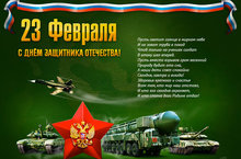 Поздравляем Вас с Днем защитника Отечества! 23 февраля - это праздник настоящих мужчин: тех, кто строит наше будущее не только на поле боя, но и в обычной, повседневной жизни; тех, кто дарит нам уверенность в завтрашнем дне; тех, кто берет на себя решение проблем, позволяя нам оставаться женщинами! Пусть Ваша жизнь будет наполнена яркими событиями, успехами и достижениями!