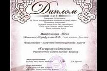 Поздравляем Лобанову Алину, Мерсияпова Тимура, Хабибуллину Илину, занявших 2-е место на I республиканском конкурсе исследовательских и проектных работ учащихся 1-4 классов "Я познаю мир". Руководитель Мерсияпова Л.И.