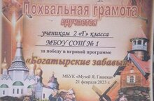 В преддверии Дня Защитника Отечества учащиеся 2Г класса посетили музей Я.Гашека, где прошло игровое музейное мероприятие "Богатырские забавы". Ребята отлично провели время, продемонстрировали свою силу, ловкость и выносливость в испытаниях "Собери богатыря в дорогу", "Бодринь", "Сильные духом". В награду класс получил Похвальные грамоты.