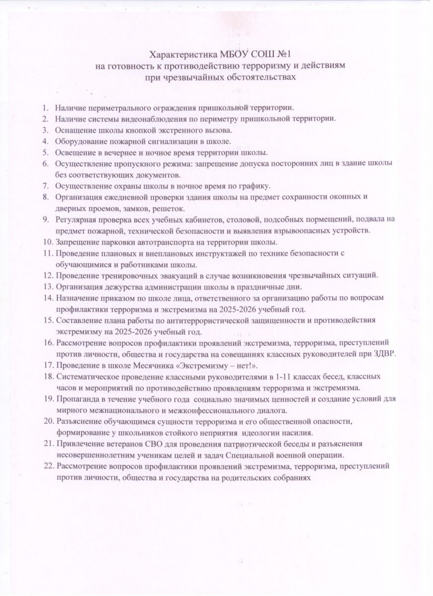 Характеристика СОШ №1 на готовность к противодействию терроризма