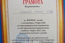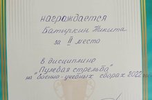 Батыркин Никита курсант 5 взвода (ученик 10 класса) занял 2 место в дисциплине "Пулевая стрельба" на военно - учебных сборах 2022 года.