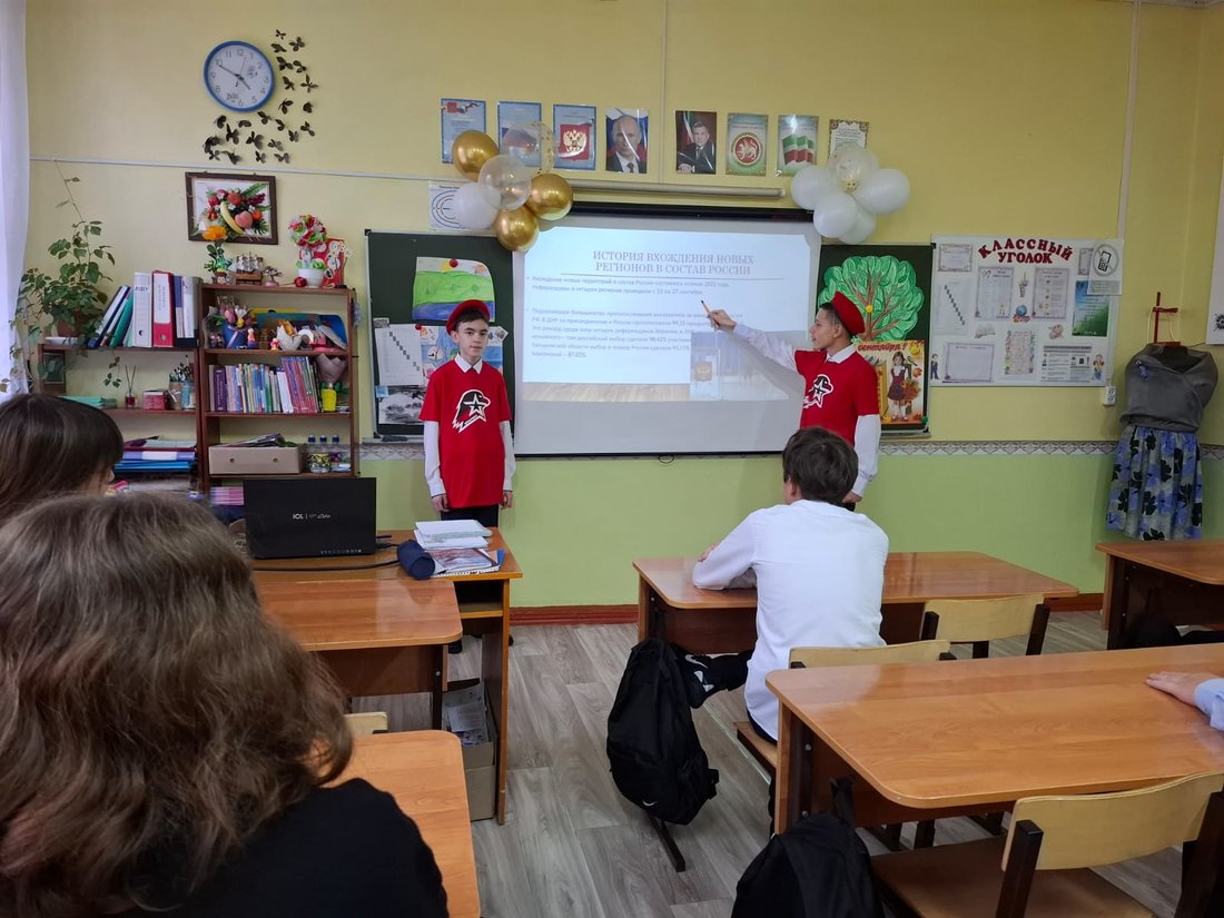 В нашей школе №11 26 сентября 2025 года юнармейцы отряда "Патриоты" под руководством советника директора Федотовой А.Н. было проведено мероприятие в сотрудничестве с Российским обществом «Знание». Лекция под названием «Возвращение в состав России: сила единства» прошла в формате классного часа.