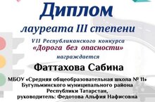 Поздравляем Фаттахову Сабину ученицу 9 класса МБОУ СОШ № 11 с призовым местом в VII Республиканском конкурсе "Дорога без опасности"
