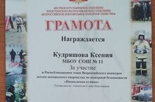 Поздравляем ученицу 3 класса МБОУ СОШ 11 Наумову Арину и классного руководителя Муравцеву Е.А. с победой в Республиканском этапе Всероссийского конкурса детско-юношеского творчества по пожарной безопасности "Неопалимая купина"
