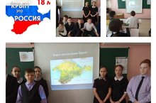 В связи с исторической датой присоединения Крыма к России в школе были проведены мероприятия, с целью воспитания у учащихся патриотизма, уважения к истории своей страны, народов, проживающих на территории Крыма. Ребята подробно познакомились с историей Крыма, им были продемонстрированы слайды роль Крыма в отечественном искусстве и культуре. Участники мероприятия совершили виртуальное путешествие- экскурсию на полуостров Крым.