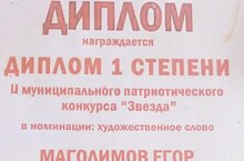 Сегодня прошёл отборочный тур во Двореце Молодёжи муниципальный военно-патриотический фестиваль-конкурс «Zвезда», учащиеся 6 класса Маголимов Егор выступил в номинации Художественное слово: