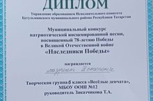 Ученицы 6 класса под руководством Заказчиковой Т.А. стали лаурятами lll степени в муниципальном конкурсе патриотической инсценированной песни ,посвященный 78- летию Победы в ВОВ "Наследники Победы„.Поздравляем!