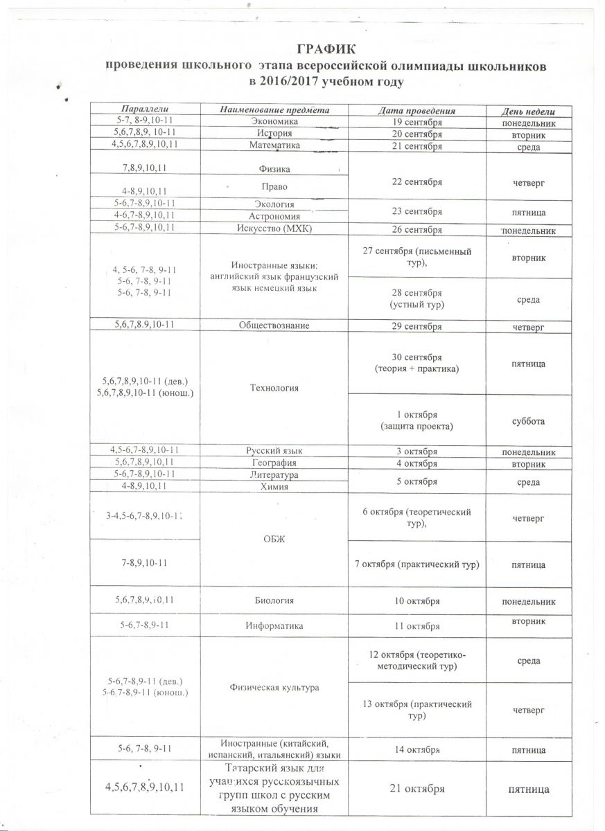 График проведения школьного этапа всероссийской олимпиады школьников в 2016-2017 уч.году.